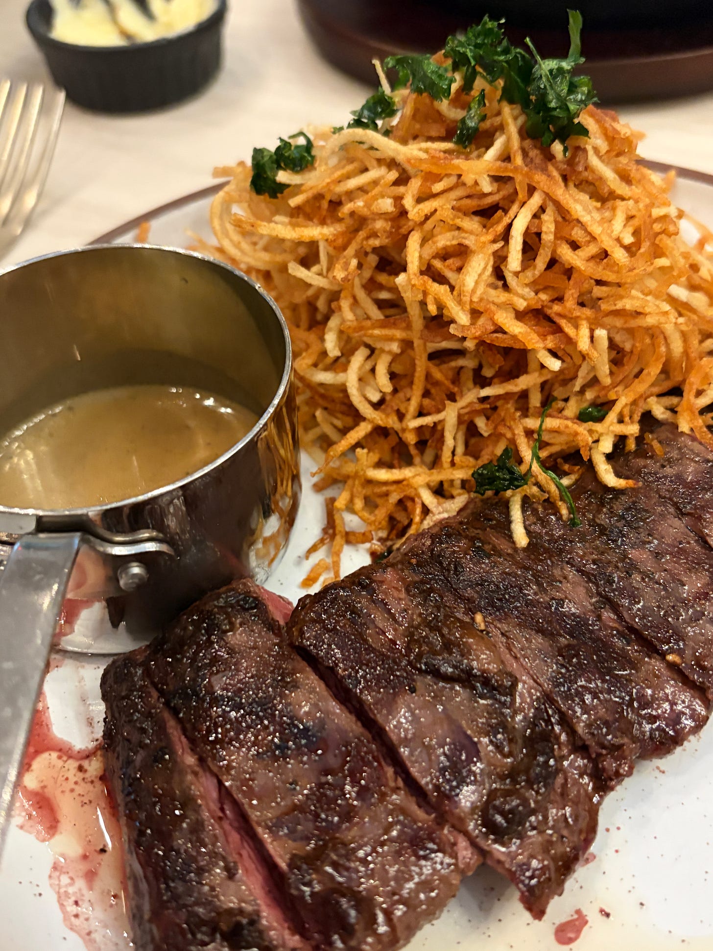 The food itself was mixed. Chrissy ordered the Local Florida Catch — salmon that evening — composed with bok choy, shaved fennel, marinated tomato, and chili garlic emulsion. It’s a specific, confident promise on paper. What arrived didn’t cohere. She described it simply as odd, and left more on the plate than she intended to. My Steak Frites was competently executed — the frites were crispy, the cognac peppercorn sauce was fine. But a skirt steak at $64 is a value proposition that demands justification, and a plate of frites doesn’t provide it.