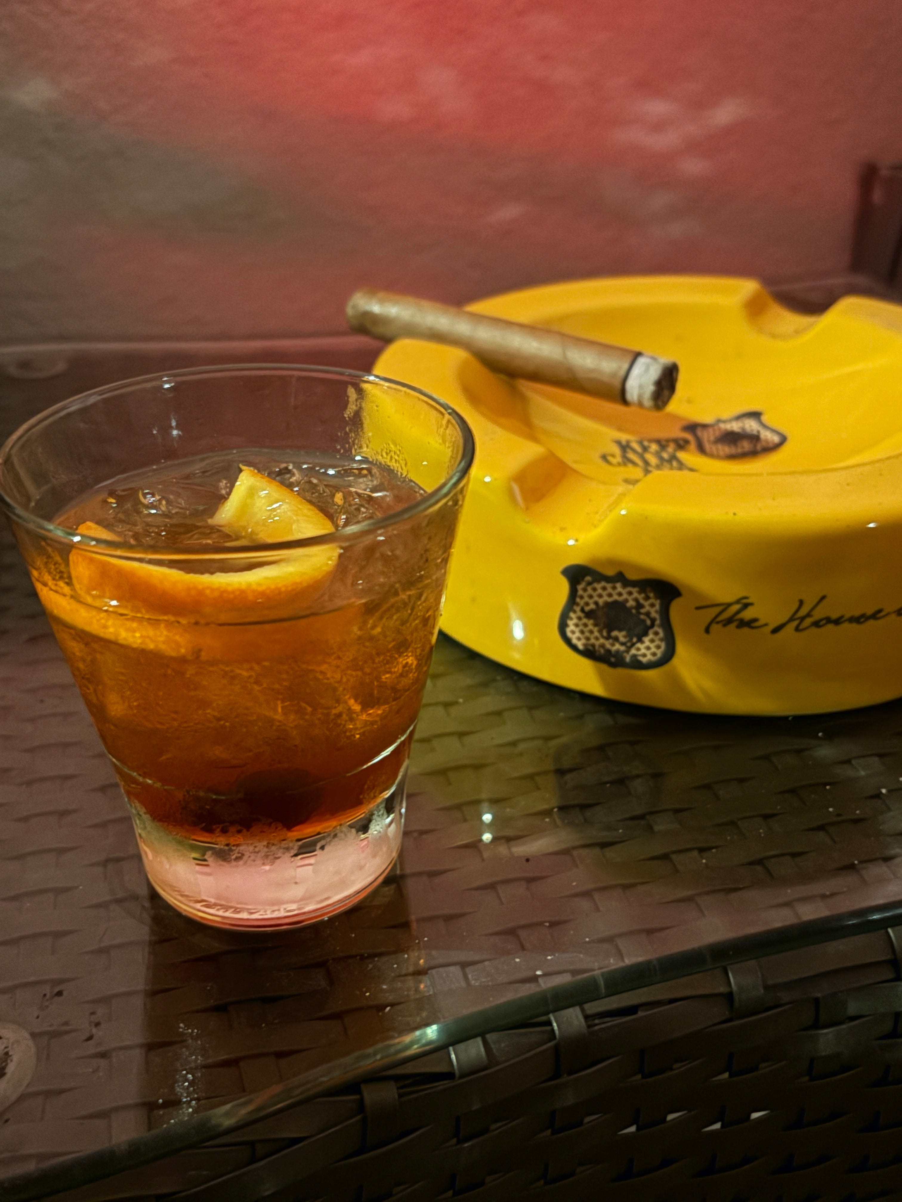 One cigar. Two people. A fresh old fashioned, simpler this time, orange peel in the glass. A yellow ashtray on the table between us.